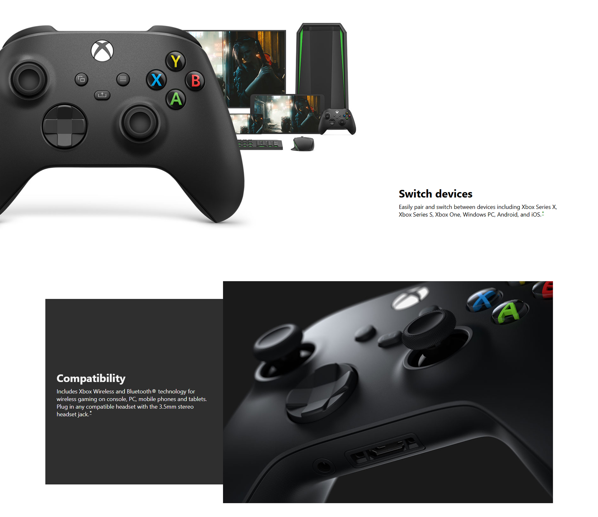 Textured triggers and bumpers | Hybrid D-pad | Button mapping | Bluetooth® technology